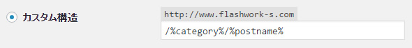 ちなみに、当サイトでも採用していますが、通常のhtmlサイトのように『カテゴリー名/ページ名』にしたい場合は、『カスタム構造』にチェックを付けて、『/%category%/%postname%』と入力します。
